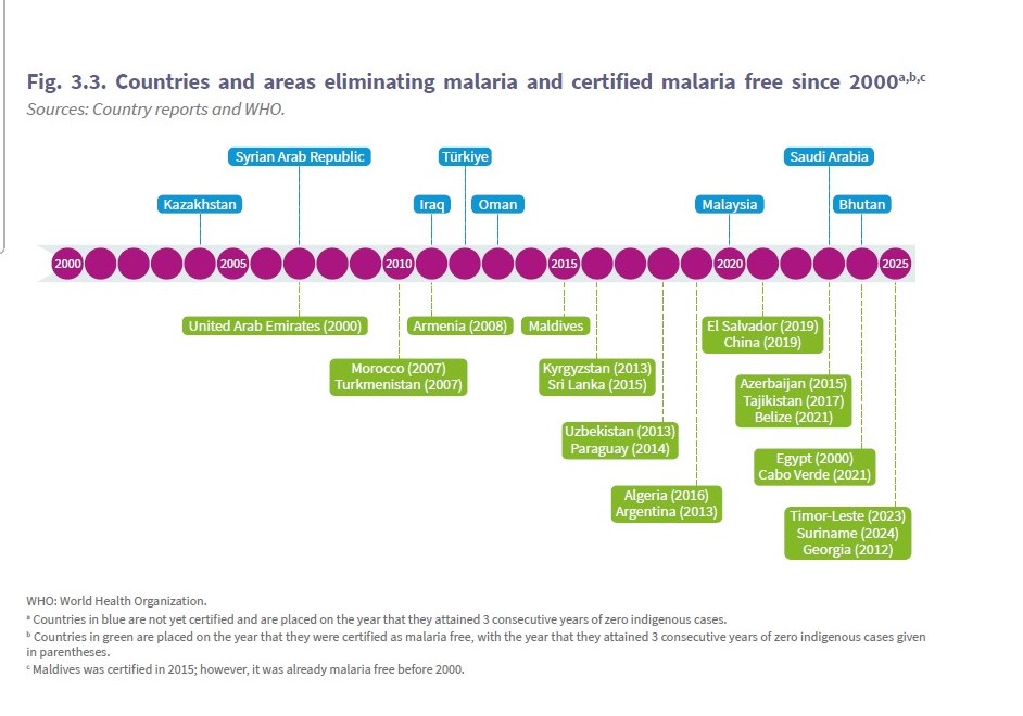 Eliminating malaria completely is not just a mere dream, but one that can be possible in Africa and beyond. Since 2017, the WHO Director-General has certified 14 countries as malaria-free. These countries include Maldives (2015), Sri Lanka (2016), and Kyrgyzstan (2016). Others are Paraguay (2018), Uzbekistan (2018), Argentina (2019), and Algeria (2019). Additionally, China (2021), El Salvador (2021), Azerbaijan (2023), and Tajikistan (2023) have been certified. More recently, Belize (2023), Cabo Verde (2024), and Egypt (2024) achieved this status. Georgia (2025), Suriname (2025), and Timor-Leste (2025) have also been recognized [5].
