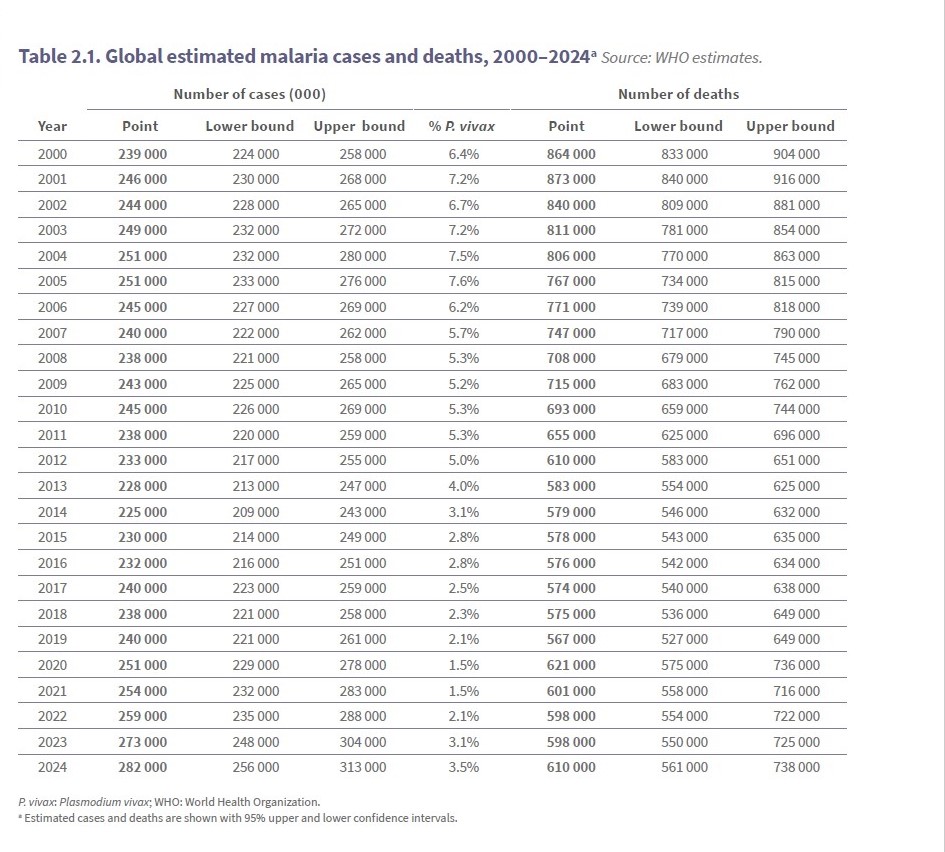 - World Health Organization, Global Malaria Programme. World malaria report 2025 [online]. Geneva: World Health Organization; 2025 [Accessed 14 January 2026]. Available from: https://www.who.int/teams/global-malaria-programme/reports/world-malaria-report-2025
