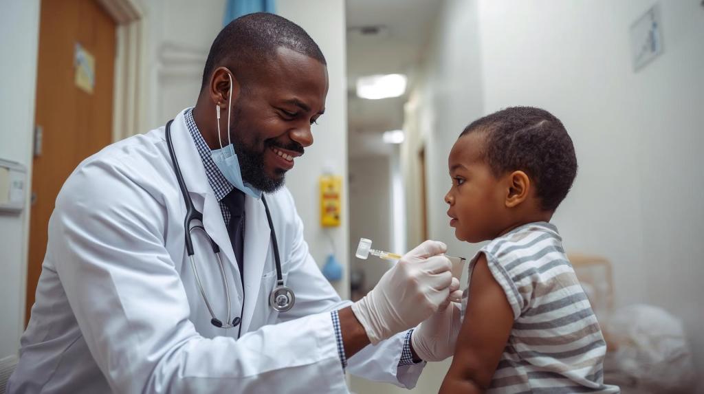 Toddler getting a vaccination by a pediatrician.