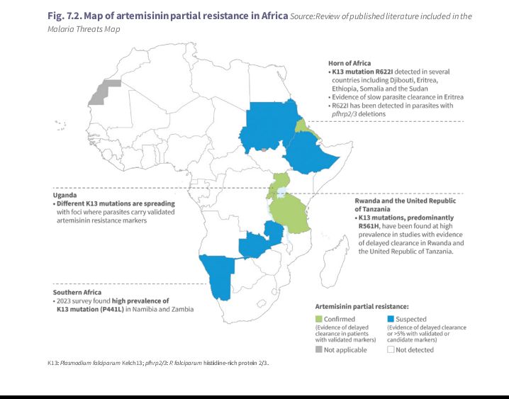 A screenshot from the WHO World Malaria Report 2025, highlighting an Africa map with countries with partial resistance to artemisinin derivatives.